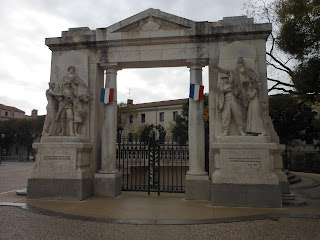 Most cities in France (and Europe, for that matter) have monuments to the soldiers of the city who died in the World Wars of the 20th century. I thought Nimes' was particularly beautiful; the street level looks like this, above, and inside and below street level is this lovely mosaic. The walls of the sunken circle are engraved with the names of the fallen.